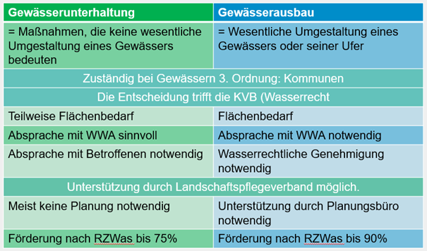 Fördermöglichkeiten: Die Verantwortung für die Bäche, die sogenannten Gewässer 3. Ordnung, tragen die Städte und Gemeinden. Bei der Umsetzung von ökologischen Maßnahmen werden sie aber nicht allein gelassen: Bei einer Gewässerrenaturierung ist nach den Richtlinien für Zuwendungen zu wasserwirtschaftliche Maßnahmen (RZWas) eine Förderung bis zu 90 % möglich.Mehr dazu